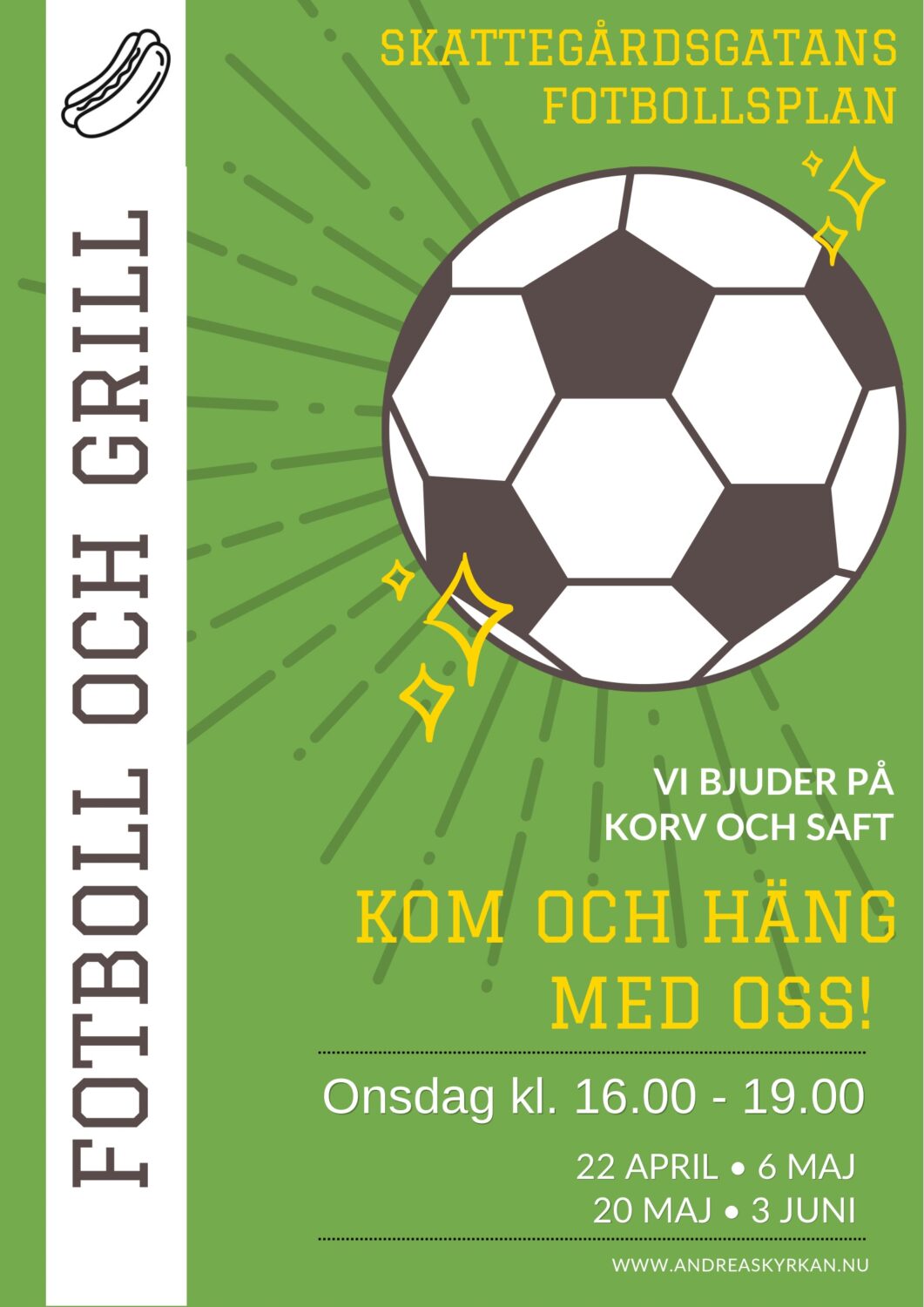 Onsdagar kl 16-19 varannan vecka spelar vi fotboll och grillar korv – och äter – på Skattegårdsgatans fotbollsplan.